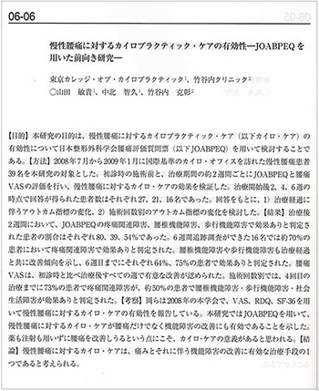第17回日本腰痛学会で院長・山田が登壇し「慢性腰痛に対すカイロプラクティックの有効性」(共同研究者:整形外科医・竹谷内、カイロプラクター・中北)について研究発表。 整形外科医、理学療法士らと共に、壇上にて慢性腰痛に対するカイロプラクティックの有効性について発表しました。